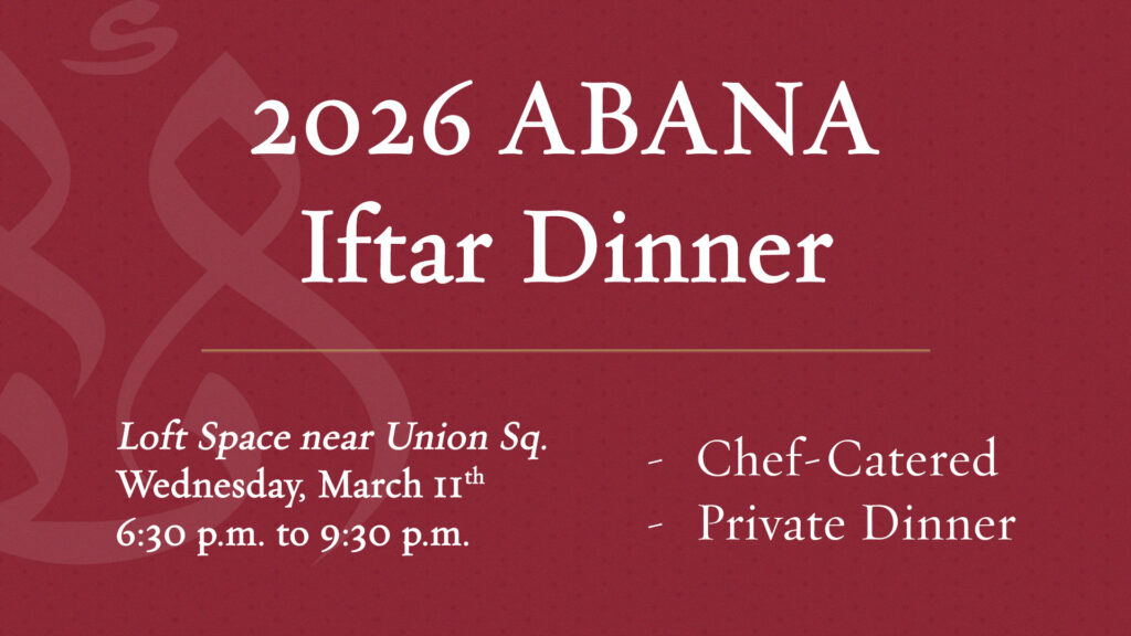 ABANA is thrilled to invite members and non-members to join us for our highly anticipated Annual Iftar, to be held on March 11th, 2026, from 6:30 p.m. to 9:30 p.m.