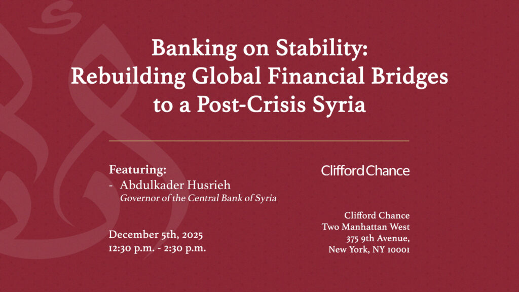 Join us at the Banking on Stability: Rebuilding Global Financial Bridges to a Post-Crisis Syria event with Clifford Chance on Friday, December 5th, 2025, from 12:30 p.m. to 2:30 p.m. at the Clifford Chance Offices (Two Manhattan West, 375 9th Avenue). Lunch will be served. The discussion will be held under Chatham House Rule.